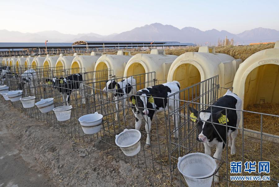 在宁夏农垦贺兰山奶业有限公司牛犊饲养区,小牛犊准备进食(2020年11月8日摄)。新华社记者 王鹏 摄