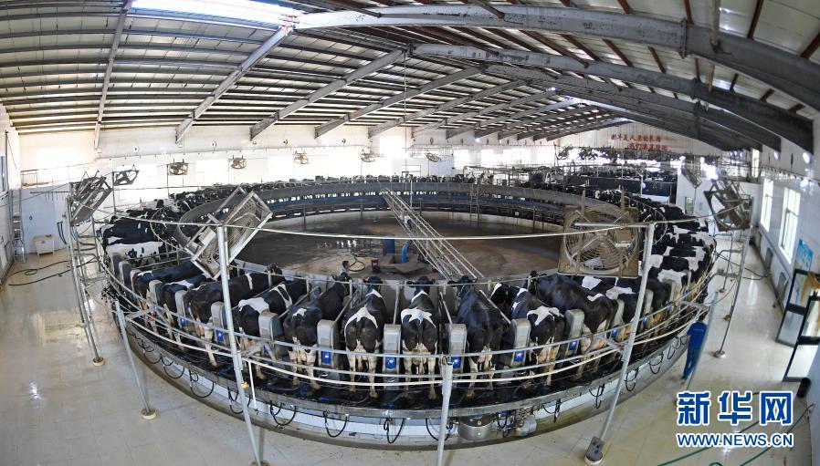 在宁夏银川市贺兰中地生态牧场有限公司挤奶大厅里,数千头“训练有素”的奶牛排队走上两个重型转盘式挤奶机,几名工人只需在一旁完成套挤奶杯的工作,几分钟到十几分钟内,机器便会完成挤奶。